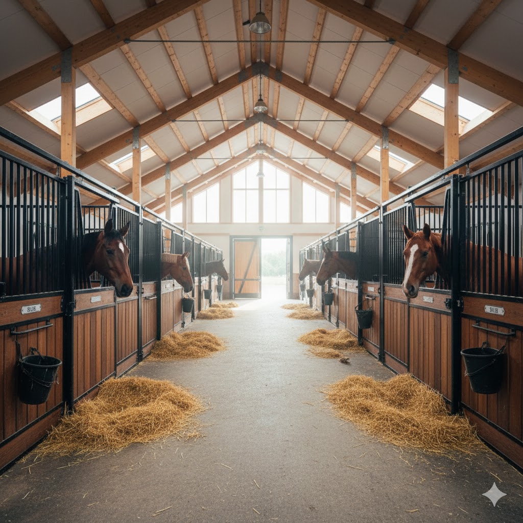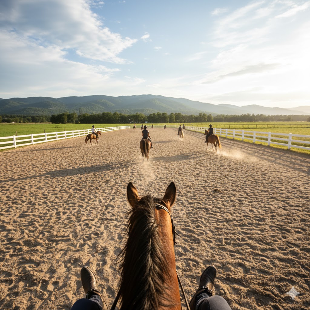 イメージは車の教習所、窓はガラス張りになってて外の乗馬の様子が見学でき、机では乗馬前の人たちが机で休憩されている様子。